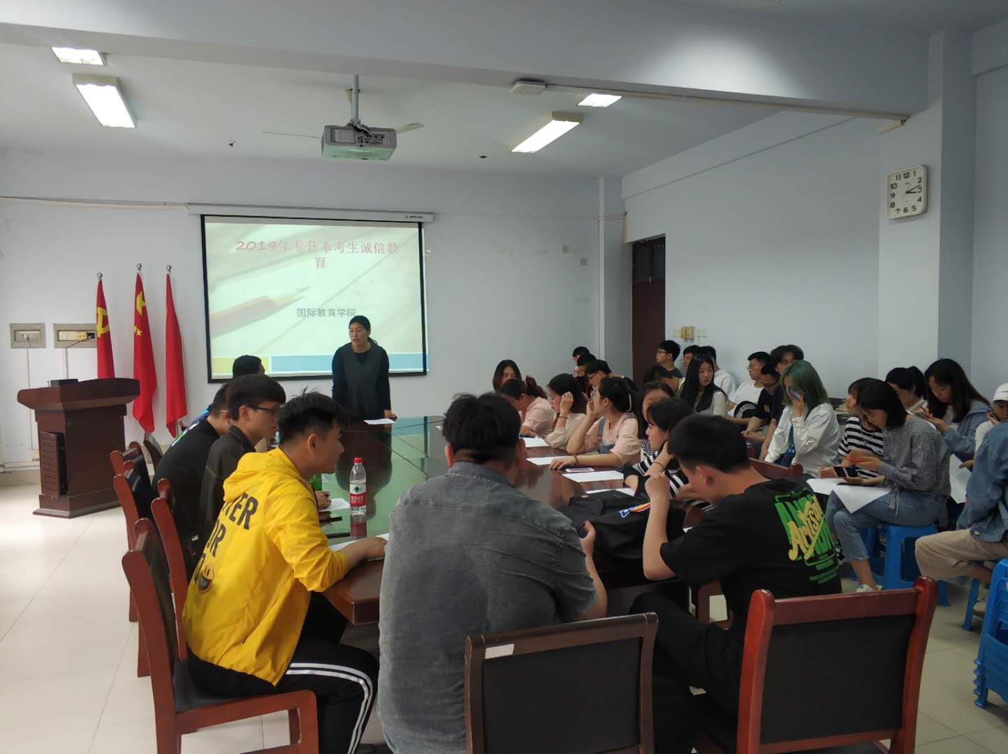 为全面贯彻落实省市和学校有关“专升本”考试的相关要求,形成良好的诚信之风,端正考试态度,提高广大同学对考试作弊严重性的认识,5月15日上午,在4206会议室对公司2019年参加“专升本”考试的考生,召开了专升本员工诚信教育签订承诺书会,会议由辅导员郭朝霞老师主持。