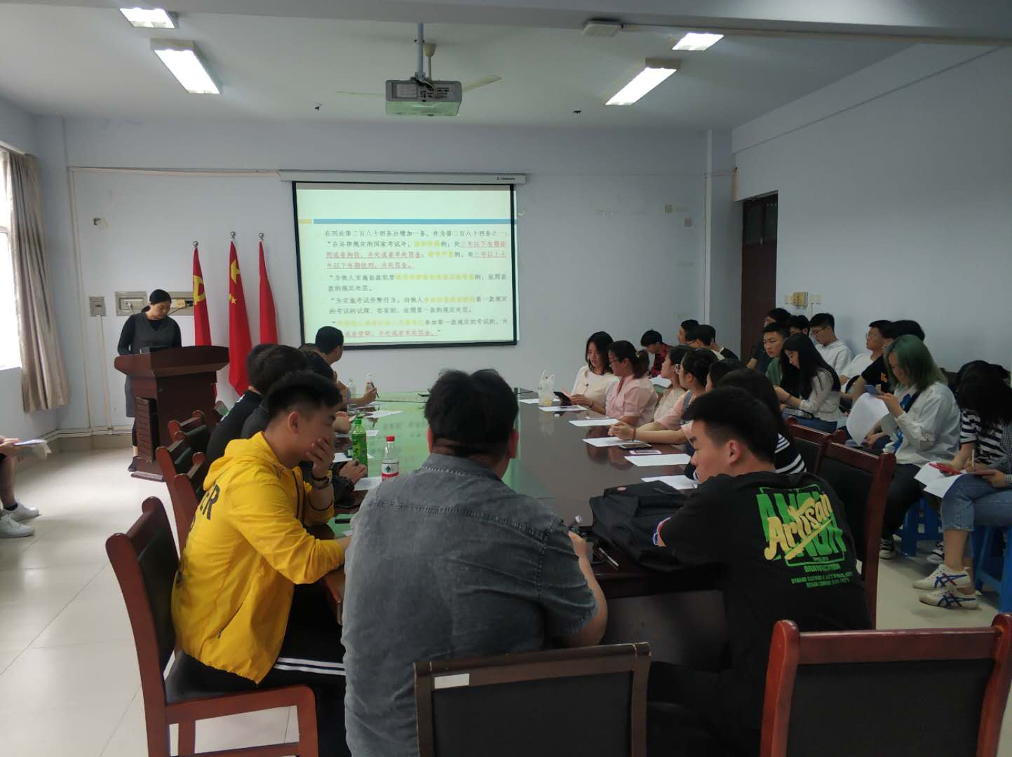 李娜老师首先强调诚信考试重要性,希望同学们自觉遵规守法,诚信考试,端正考试态度,规范考试行为,防微杜渐,避免违纪行为的发生,以良好的心态积极迎接考试。辅导员郭朝霞为同学们宣读了《中华人民共和国刑法》(修正案九)摘要和《中华人民共和国教育法》摘要,再次重申考试作弊入刑法的重要规定,提醒考生一定要遵守考试规定,诚信考试。